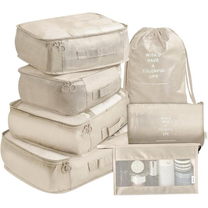 Setul include 7 piese de diferite dimensiuni, ideale pentru sortarea hainelor, lenjeriei, încălțămintei, cosmeticelor, accesoriilor și obiectelor personale. Fiecare organizator este echipat cu fermoar durabil, mâner practic sau plasă vizibilă pentru identificarea rapidă a conținutului.