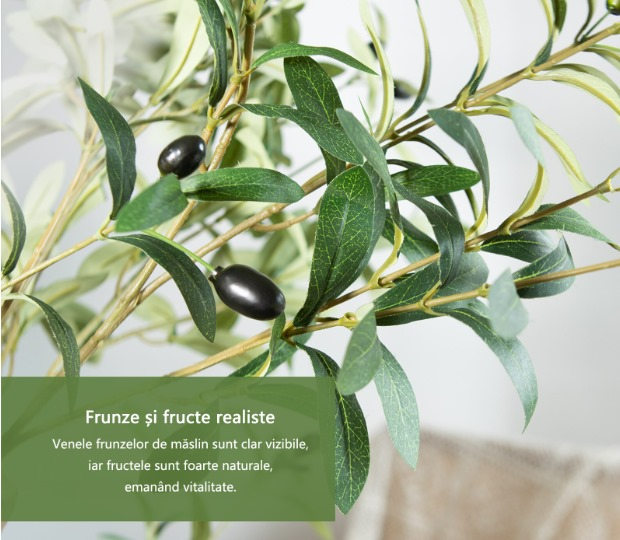 Aceasta maslina artificiala de 120 cm adauga un farmec natural si un plus de stil oricarui spatiu, fie el interior sau exterior. Realizat din material PE premium, aceasta maslin are un aspect autentic, cu frunze detaliate si o structura naturala ce imita perfect o maslin adevarata.