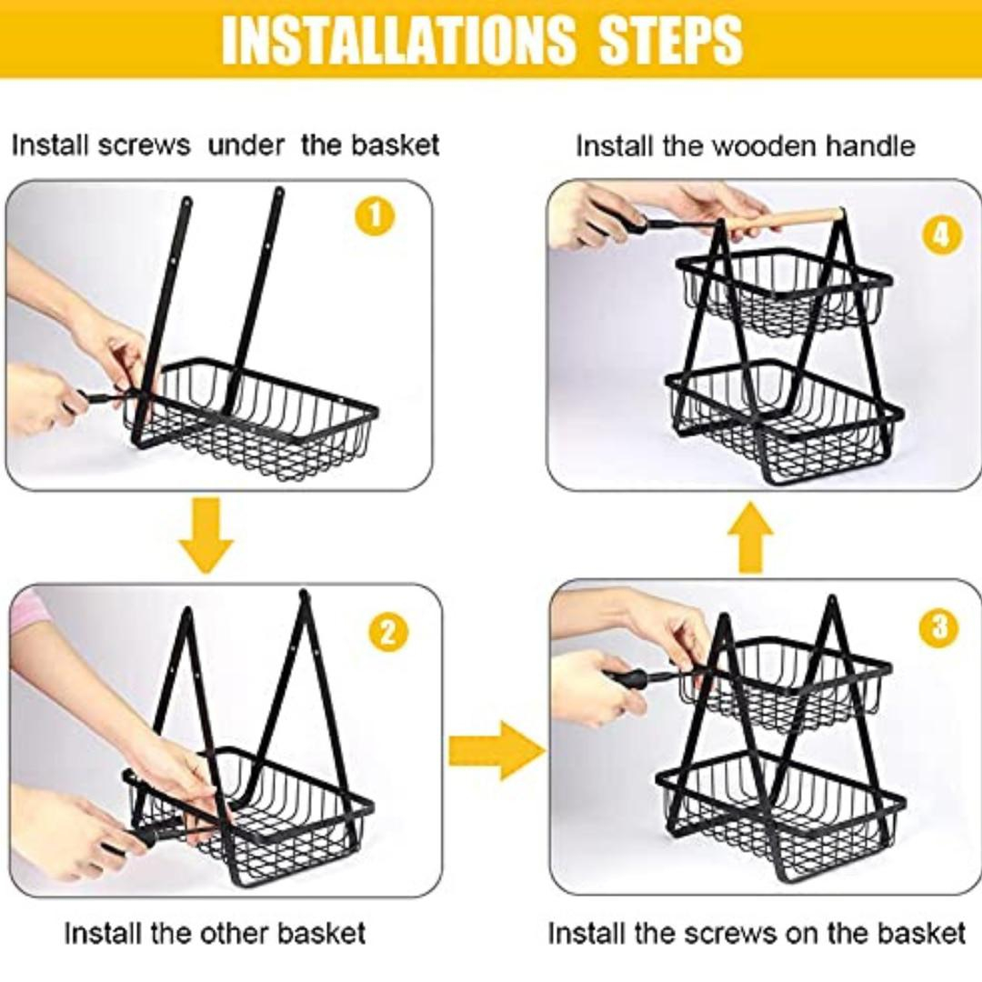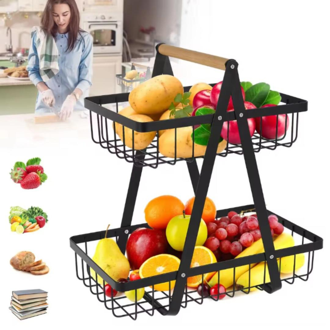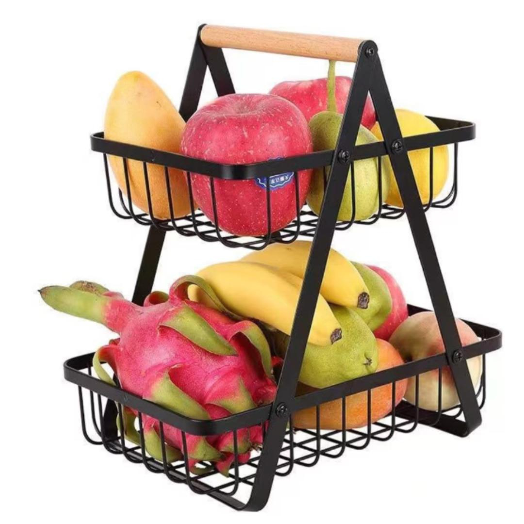 Organizează-ți fructele și legumele cu acest coș cu 2 etaje, realizat din metal negru durabil și prevăzut cu mâner din lemn elegant. Designul său stabil permite depozitarea eficientă a produselor, economisind spațiu pe blatul de bucătărie sau pe masă. Perfect pentru bucătării moderne, piețe sau zone de servire, acest coș combină funcționalitatea cu un aspect estetic plăcut.